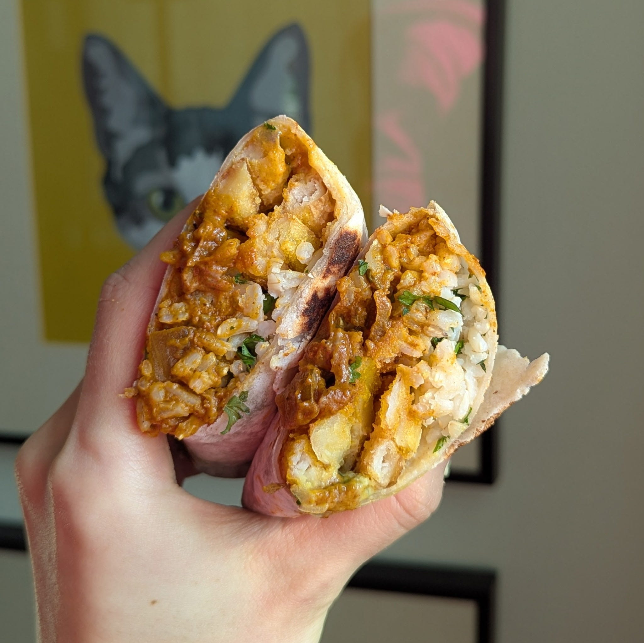 And that’s a wrap! Er, burrito. Whether you make a tray of fries or burrito (…or both 🙃), we think you’ll love the creamy, spicy, and savory blissful oral hell this buffalo curry offers. If you have any comments or questions, let us know! Especially if we really screwed something up. 🥲 Thanks as always for taking the time to sus out our posts! See ya next time.