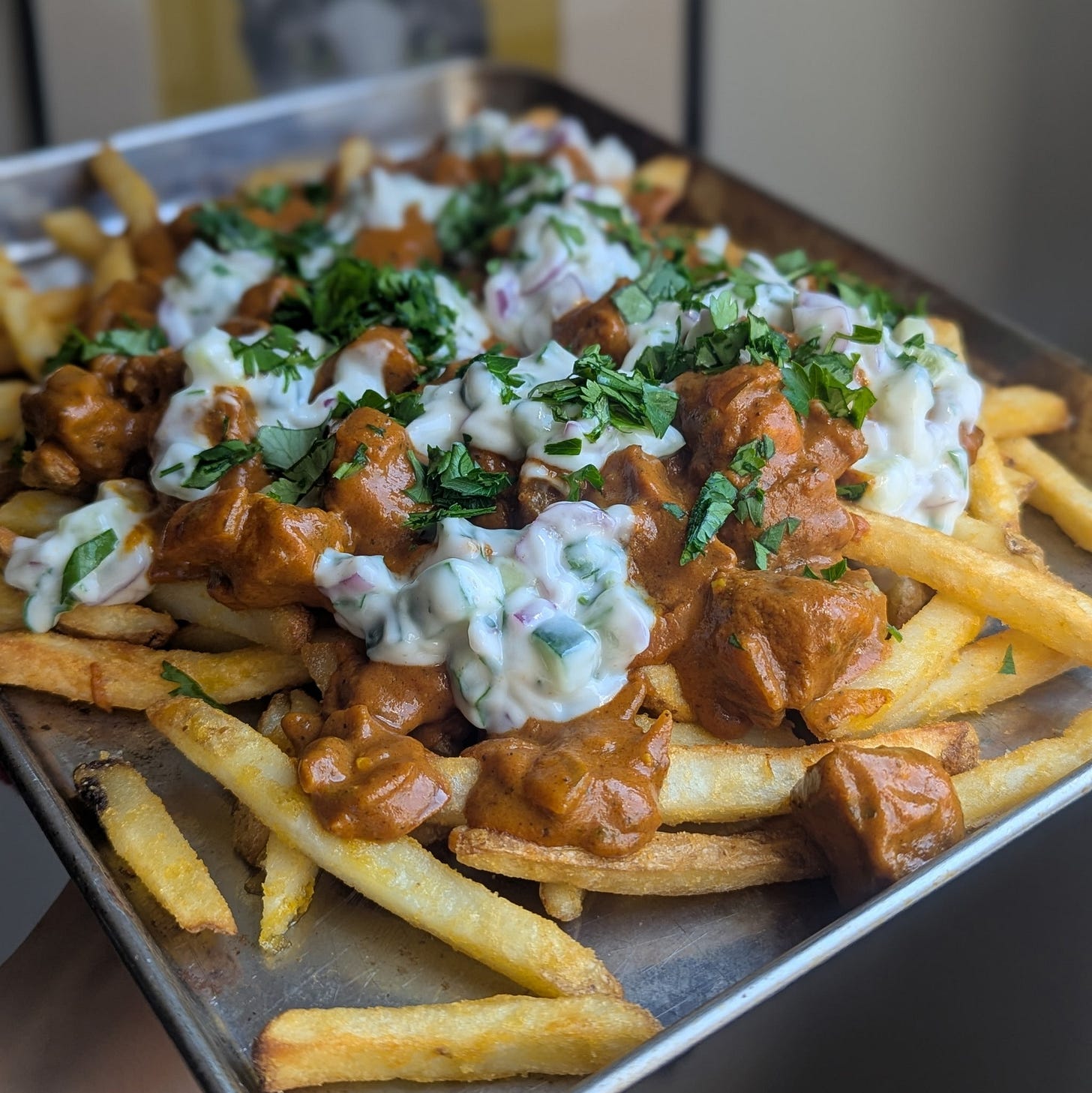 Cook fries to package instructions. Dust with a bit of curry powder and a sprinkle of salt. Place fries on whatever you wanna eat off of, then ladle over the curry, add raita, fresh cilantro and parsley, and top it off with a squeeze of fresh lemon juice.